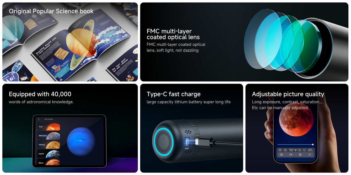 Smartphone ca ghid al telescopului pentru a explora minunile cerești fără efort, chiar dacă sunteți nou în privința stelelor.” Observație în timp real pe ecranul mare